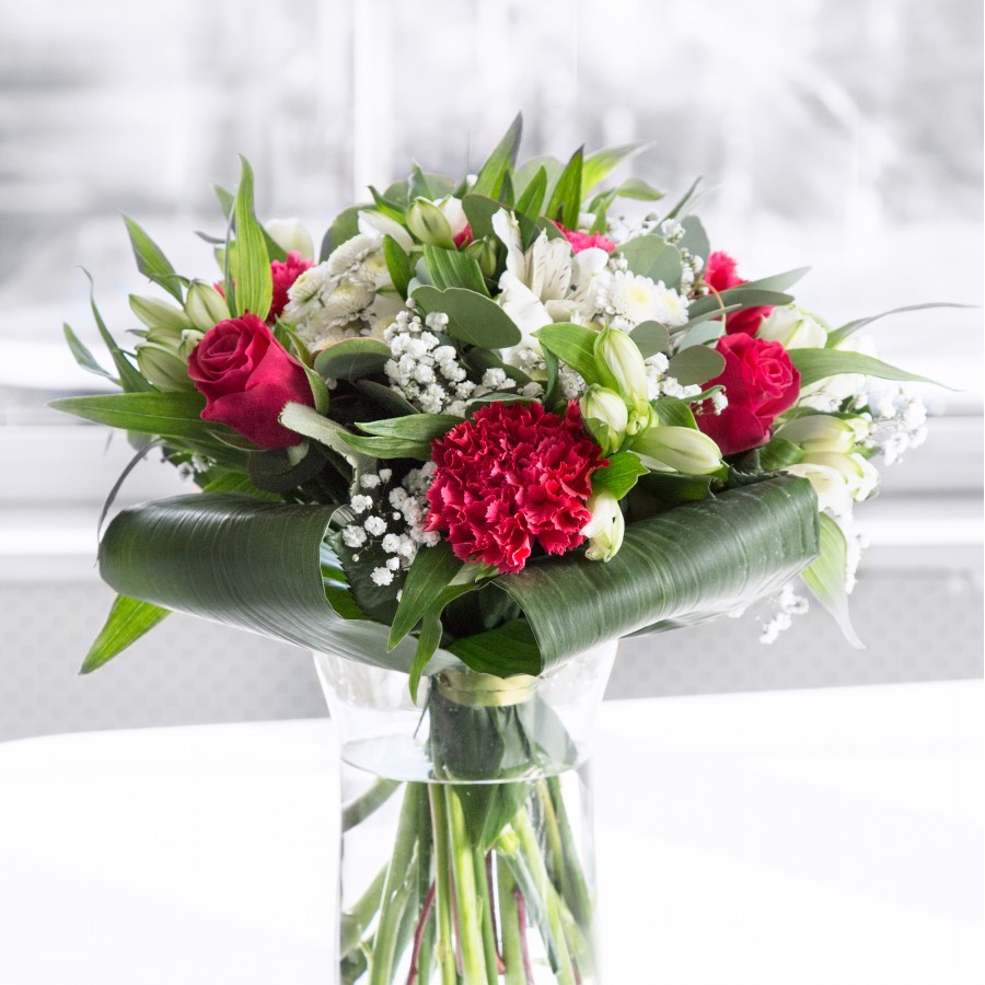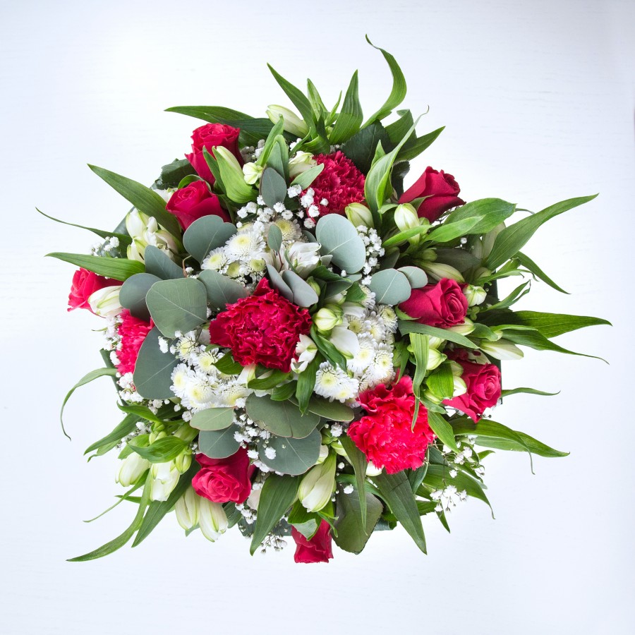 Discover the elegance of our Red Roses Bouquet, a harmonious blend of vibrant red roses, sweet white chrysanthemums, and delicate gypsophila. Enhanced with carnations and white alstroemeria, this bouquet offers a unique and luxurious appeal.