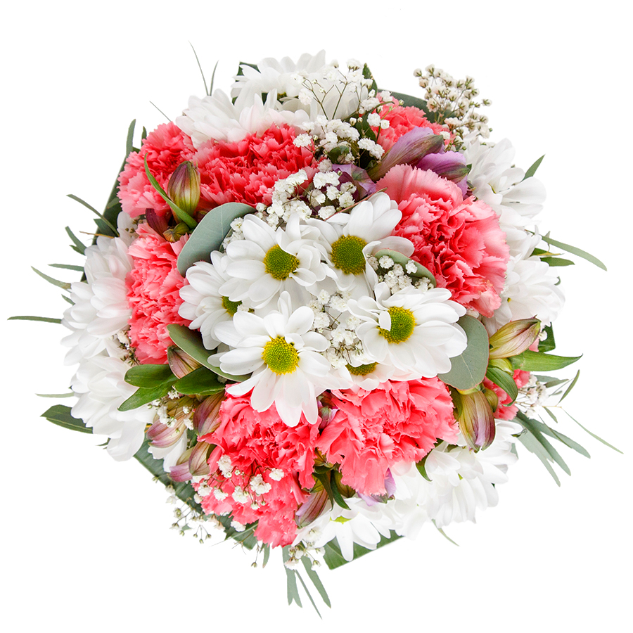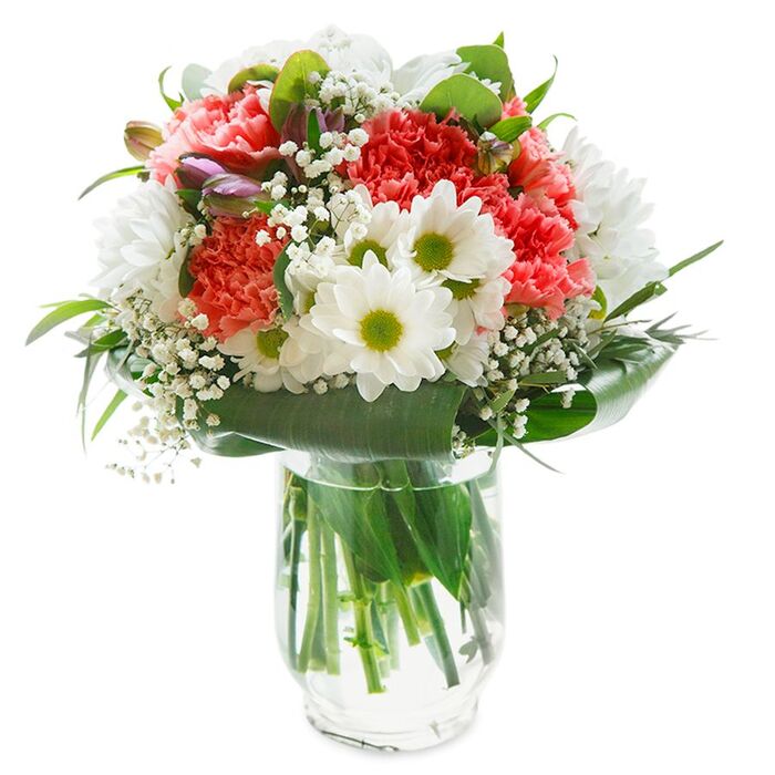 Our luxurious flower arrangement is designed to impress. Featuring pure white chrysanthemums, delicate gypsophila, and soft pink carnations, all wrapped in vibrant aspidistra leaves, this bouquet exudes elegance and charm.
